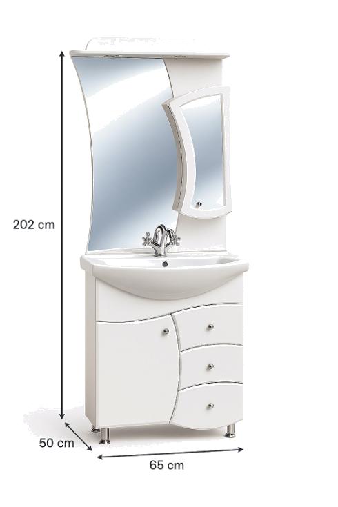A Guido TREND 65 fürdőszoba bútor egy komplett, álló kivitelű bútorszett, amely alsó mosdószekrényből és felső tükrös elemből áll. Klasszikus stílusa és ívelt vonalvezetése időtálló megjelenést biztosít, így harmonikusan illeszkedik hagyományos és modern fürdőszobai környezetbe egyaránt.