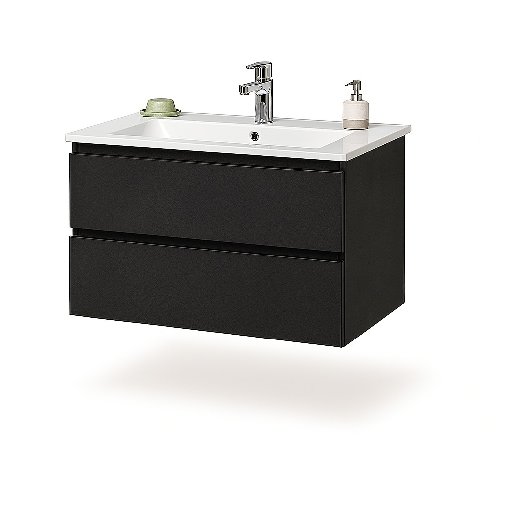 Szekrény: korpusz és a front laminált lap, kerámia tállal. 2 fiókos, csillapított fiókvasalattal. Készre szerelve.